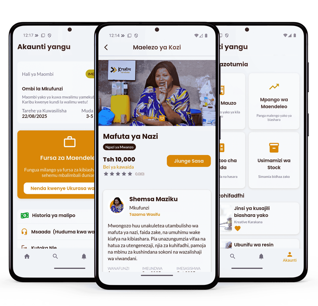 Jifunze kozi za vitendo kwa Kiswahili zinazofundishwa na wafanyabiashara halisi, pamoja na nyenzo na huduma za kidigitali kwa biashara za Tanzania.